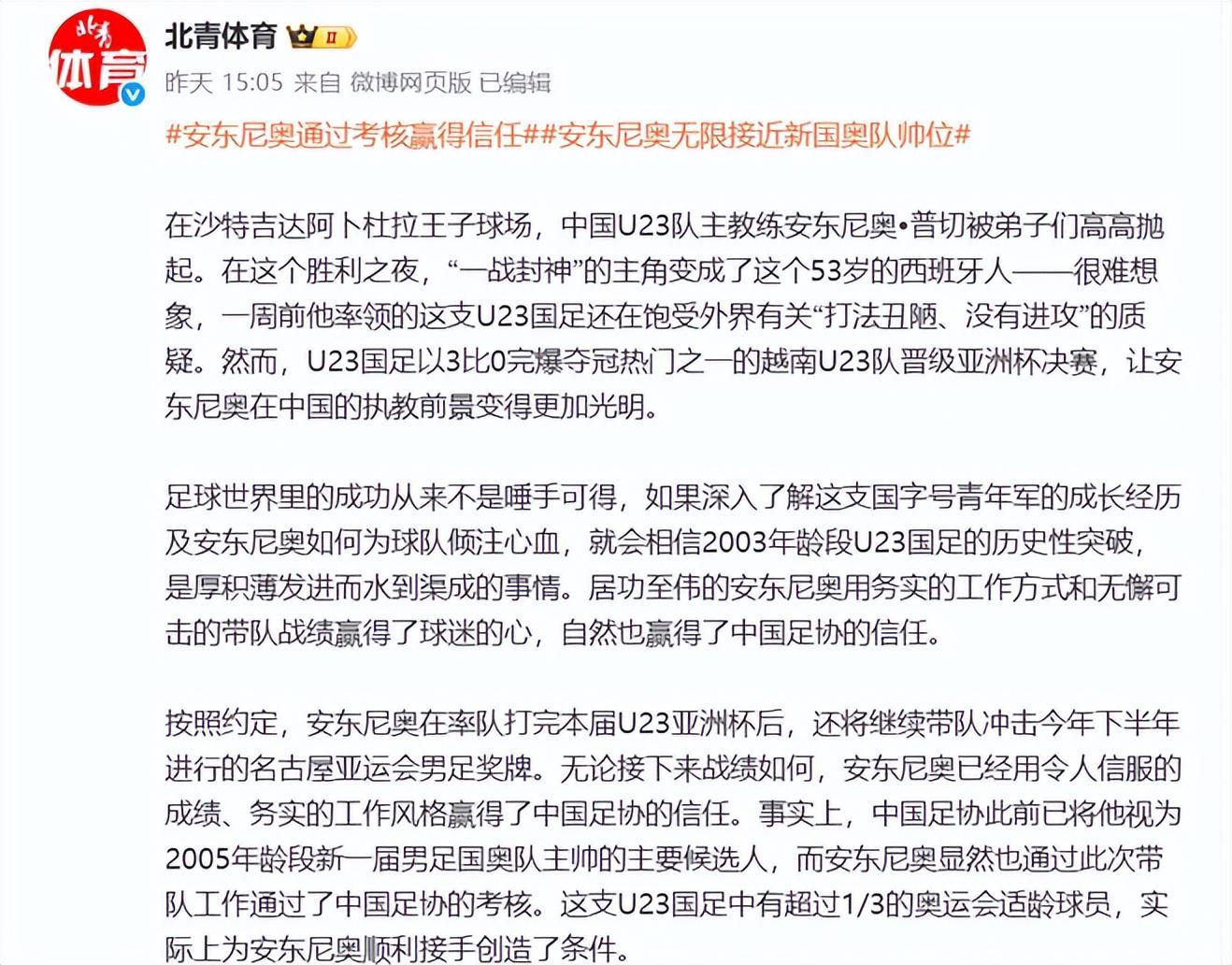 据《北青体育》最新消息显示,中国足协已基本确定,等到安东尼奥完成本届亚洲杯及后续亚运会任务之后,将大概率任命他出任新一届国奥队的主帅,全力冲击2028年洛杉矶奥运会。这一安排彰显了中国足协国字号队伍建设的长期规划思路。堪称一个明智之举。